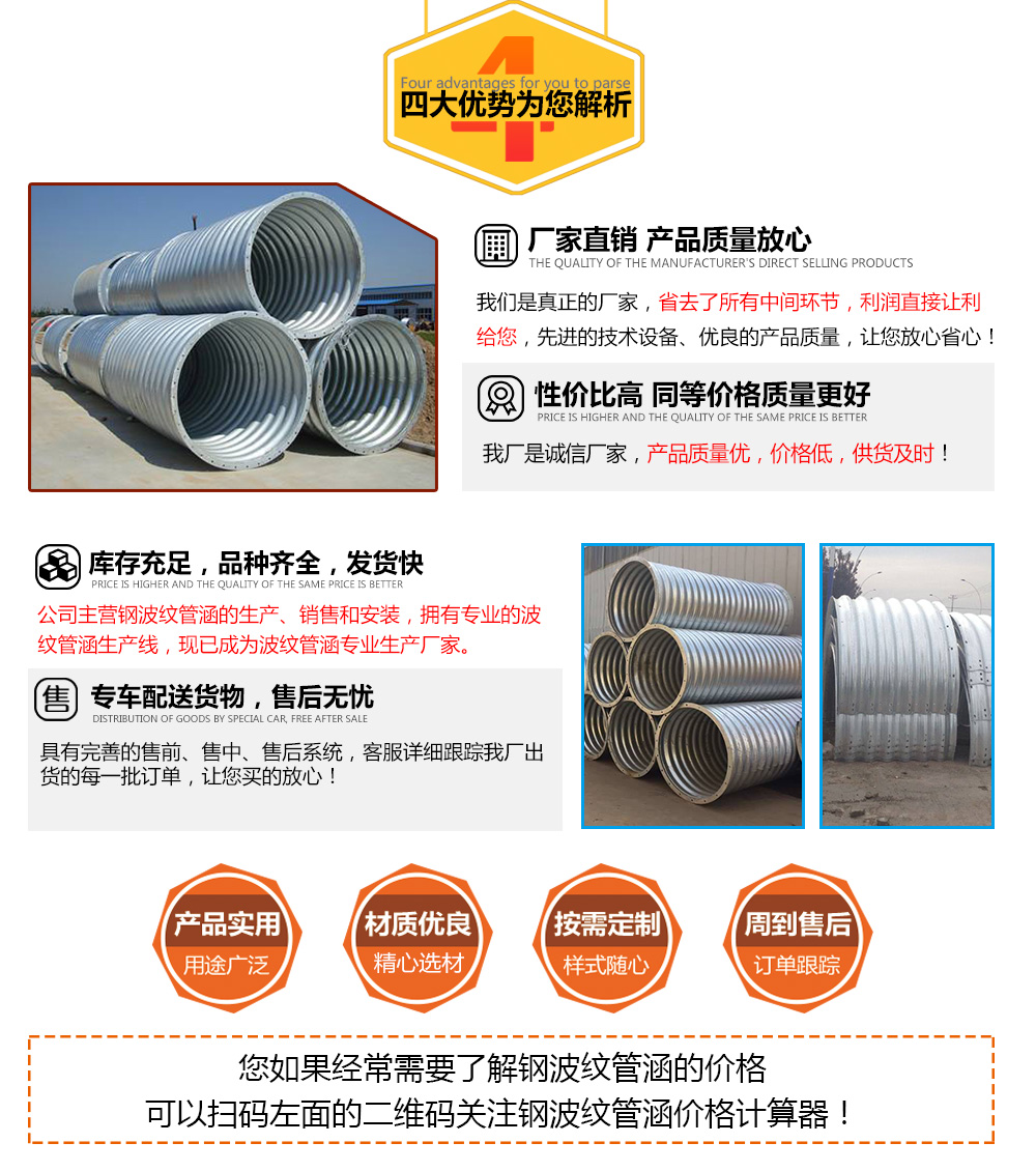 鋼波紋涵管采用專業(yè)技術(shù)設(shè)計(jì),標(biāo)準(zhǔn),集中化生產(chǎn),現(xiàn)場(chǎng)安裝拼裝,土建與型材可分開實(shí)施 ...